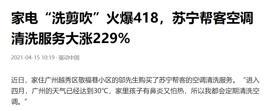 看看去年苏宁帮客418服务节,只是空调清洗业务就涨了229%。