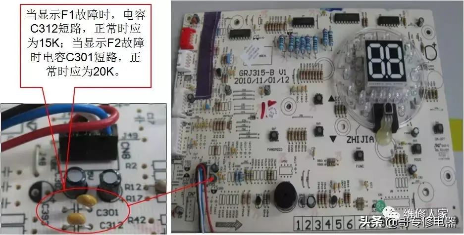 当显示F1故障时,电容C312短路,正常时应为15K;当显示F2故障时电容C301短路,正常时应为20K。