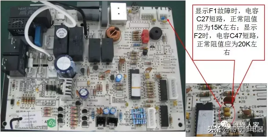 显示F1故障时,电容C27短路,正常阻值应为15K左右;显示F2时,电容C47短路,正常阻值应为20K左右。