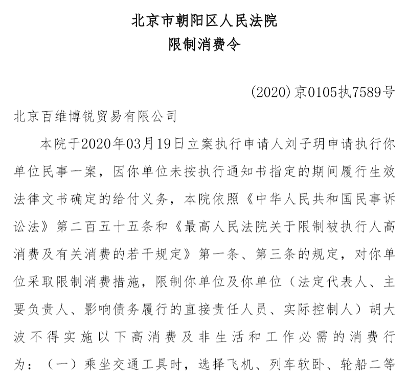 另一据称对联络互动业绩产生影响的公司为北京百维博锐贸易有限公司(下称“百维博锐”),新京报记者发现,其已经被法院下发限制消费令。例如北京市朝阳区人民法院6月10日作出的(2020)京0105执7589号限制消费令。