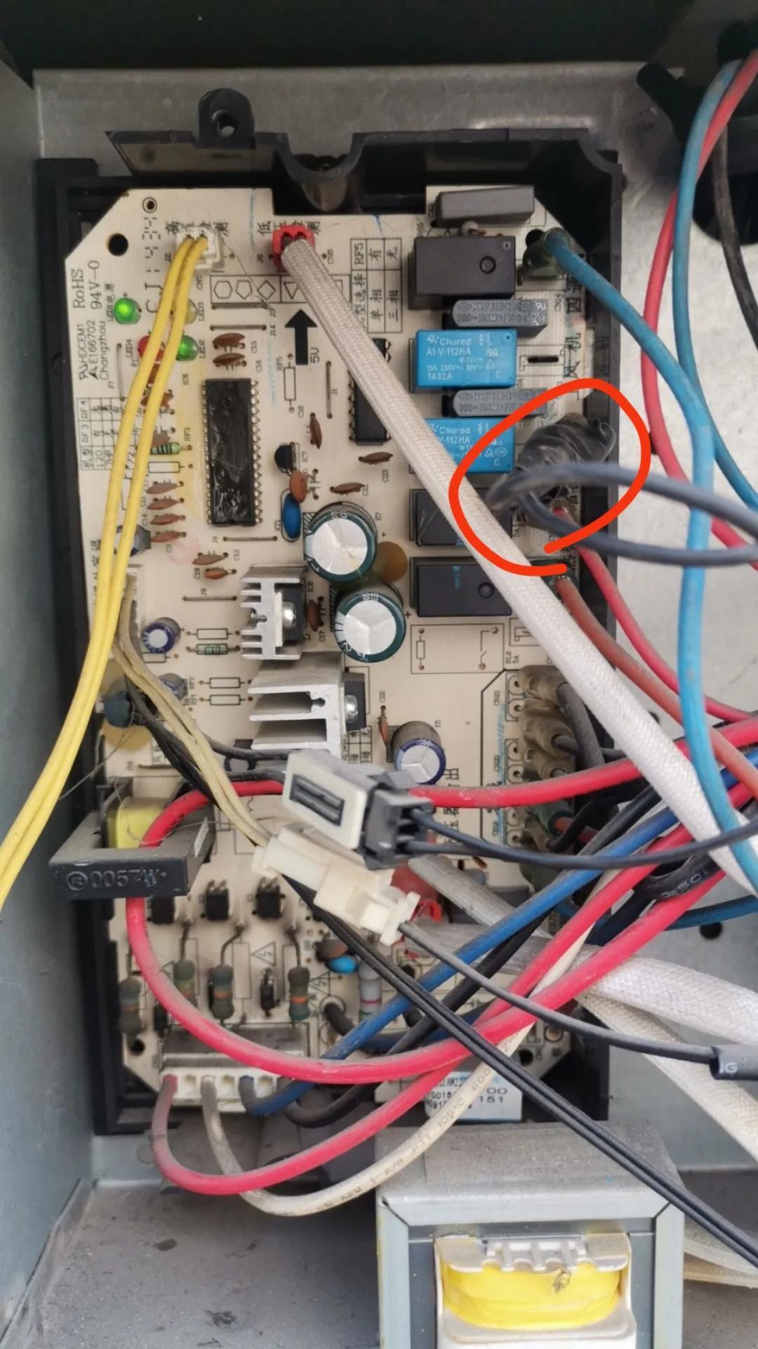 这个故障代码比较常见,表示的是过热停机保护。直接查看外风机,上风机不工作,测量上风机阻值,阻值正常。再观察下风机,下风机工作正常。直接跳线解决。
