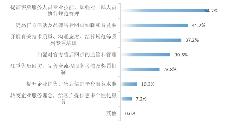 充分发挥行业协会作用,加强行业自律。 提升从业人员业务能力,提升服务质量;加强行业诚信体系建设,推广诚信经营典型案例;推动行业服务标准统一,对售后维修等服务流程等方面制定相应团体标准,设立从业人员准入门槛,通过持证上岗制度将家电服务纳入规范化管理。