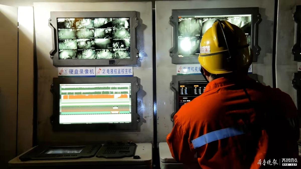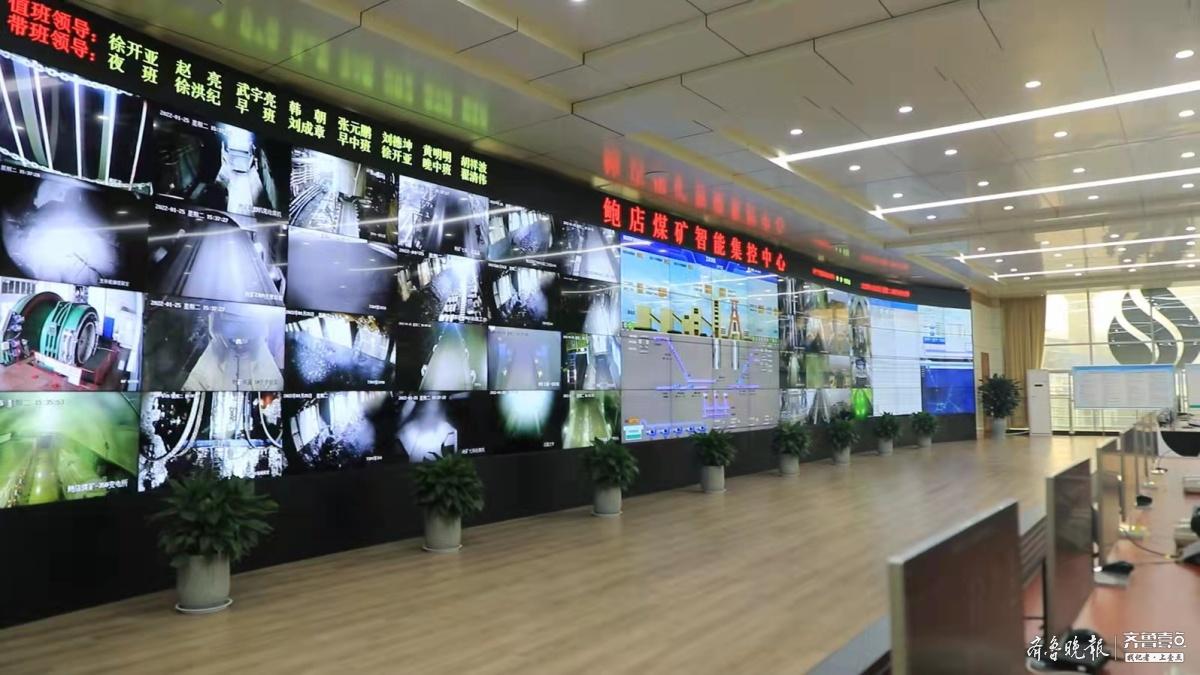 齐鲁晚报·齐鲁壹点记者在鲍店煤矿地面智能集控中心的巨大电子显示屏上看到,井下400多米深处工作面的采煤设备自动运转,割煤、移架、推溜、放煤、运煤,一切井然有序,滚滚的“乌金”如流水般“奔”向地面。