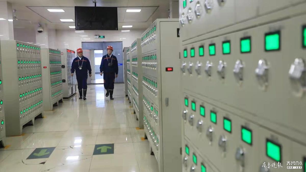在鲍店煤矿矿灯房,即将下井的职工们需要通过“便携仪智能化管理系统”刷脸,就能快速地获取属于自己的下井装备。齐鲁晚报·齐鲁壹点记者看到,这套“便携仪智能化管理系统”由储物柜组成,工人只需要找到属于自己的柜子,通过刷脸、刷卡等方式开箱,快速领取下井的装备。