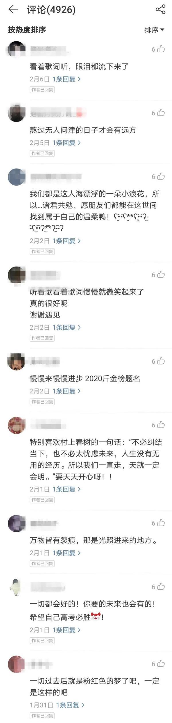“无意间听到了你写给抑郁症患者的歌,我瞬间心里温暖了一下。谢谢你这首歌,让我又活过来了。”