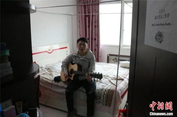 关海洋的家里并不宽敞,张贴着“大先生独立音乐工作室”的卧室里摆放着多把吉他,床和衣柜中间仅有的一点空间,也被他改造成了录音棚。说是录音棚,其实就是一张桌子、一台电脑、一个麦克风和一个伴奏用的电子琴,周边是用拆开的电器包装纸箱做成的隔音板。