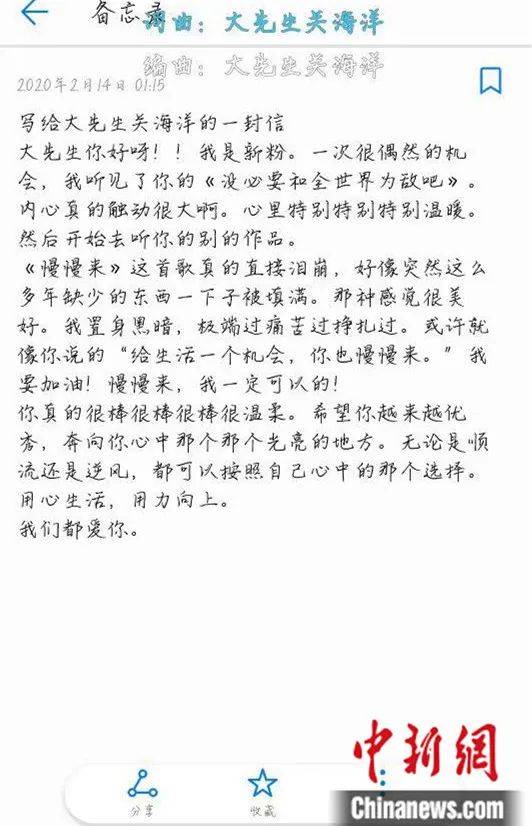 众多的后台评论,关海洋都会逐条翻看,大多都会给予回复,通过互动交流了解他们的内心想法,并持续给予鼓励。不仅如此,他还在这些评论里寻找抑郁症患者的故事,激发灵感创作了更多的“治愈系”歌曲。
