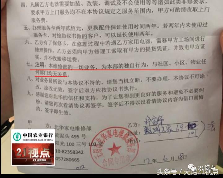 许阿姨给记者出示了一份盖有公章的协议书和一张服务维修卡,协议书上的抬头是“无锡市北华家电维修服务部”,不仅落款没看到社区的公章,就连协议中也清晰注明:“本维修部的一切业务为独自行为,与社区、小区、物业均无联系。”