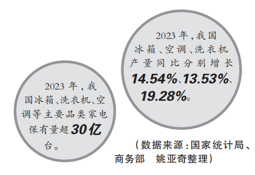 数据显示,2023年,我国冰箱、洗衣机、空调等主要品类家电保有量超30亿台。中国家用电器研究院应用技术研究所副所长、电器循环与绿色发展中心主任田晖表示,我国家电行业已经从单纯的“增量时代”进入到“增量和存量并重时代”。因此,激活庞大存量市场将带来更多的商业空间和发展机遇,推动从“无”到“有”的消费需求向从“有”到“优”的全面升级释放。