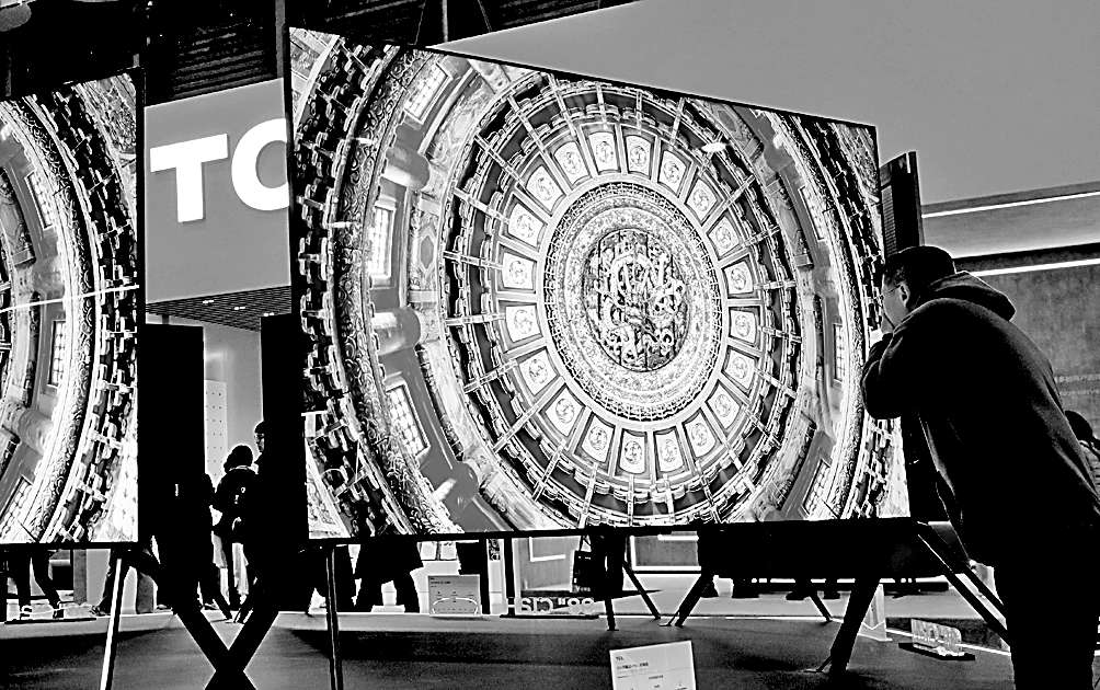 在日前举行的中国家电及消费电子博览会上,一名观众近距离观察一款电视展品。新华社发