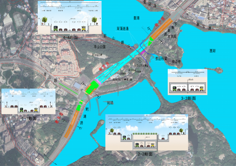 考虑到西湖景区的游客众多,该方案还规划设置了慢行交通系统。项目沿线在丰山路口以南及慈云路、菱湖路接口段沿道路两侧布置非机动车道,在下穿丰山段结合地面园林景观布设慢行通道,保障项目范围内慢行系统的连续贯通