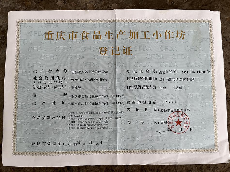 王亚琼向记者提供的证照资料显示,“毛妈妈经营部”于2017年8月24日取得《食品经营许可证》,经营项目为预包装食品和散装食品(含冷藏冷冻食品)销售,许可证有效期至2022年8月23日,发证机关为原重庆市食品药品监督管理局忠县分局。2021年5月8日,忠县市场监管局向“毛妈妈经营部”颁发《重庆市食品生产加工小作坊登记证》,证载食品类别及品种包括蔬菜制品、豆制品和肉制品等。此外,“毛妈妈经营部”还专门申请了“毛兰英”的商标。