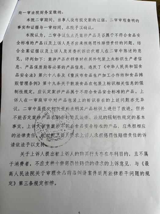 判决书显示,重庆一中院认为,关于“毛妈妈经营部”提出邵佰春的购买行为存在牟利目的,且不属于消费者,不应支持十倍惩罚性赔偿的请求的上诉意见,与《最高人民法院关于审理食品药品纠纷案件适用法律若干问题的规定》第三条(编辑注:第三条 因食品、药品质量问题发生纠纷,购买者向生产者、销售者主张权利,生产者、销售者以购买者明知食品、药品存在质量问题而仍然购买为由进行抗辩的,人民法院不予支持)规定相悖。综上,“毛妈妈经营部”的上诉意见不能成立,原审判决正确,应予维持。判决:驳回上诉,维持原判。