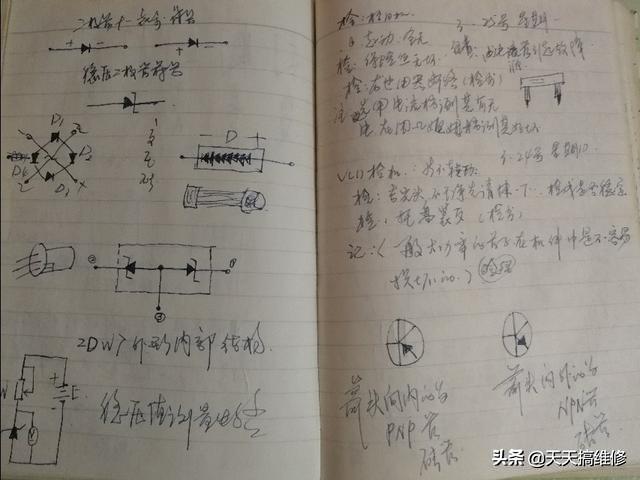 几本笔记本也图满了各种常见的电子元件的功能应用图,有些知识必须死记硬背,就像小学生背剩法口决表一样,你必须记住,记得电阻色环表,抄抄写写好一段时间才记住,棕红橙黄绿蓝紫灰白黑金银,想忘也忘不了……