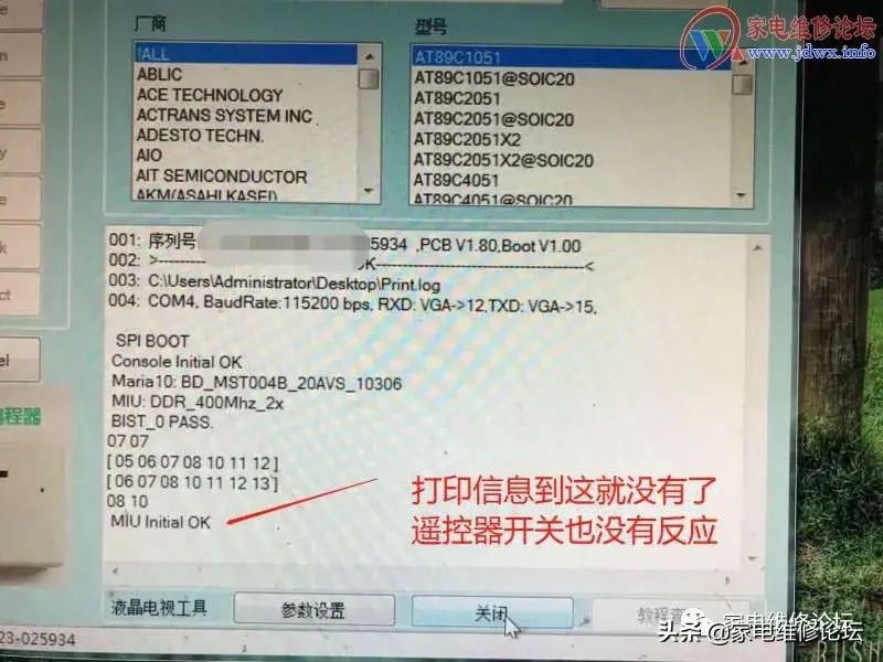 写入方法如图所示:1、编程器与彩电相连2、按顺序设置好编程器,备份下原机数据(以免不是数据问题)顺便查看一下打印信息。3、打印信息不完整,那我们写入好的数据,写完后彩电正常开机,打印信息也正常。(作者:蜜蜂维修www.jdwx.info)