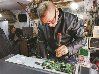 刘水平在维修液晶电视机。(余建文 摄)