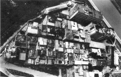 上世纪九十年代的渔民村,私搭乱建盖满了“握手”楼、“亲嘴”楼。新京报记者 浦峰 翻拍自渔民村村史博物馆