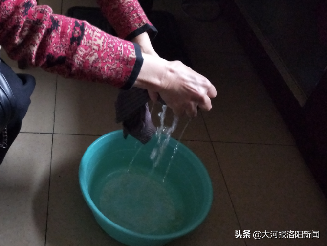 在小区5号楼张女士家的客厅里,张女士为了向记者证实家中漏雨情况严重,她将铺在地板上的一块抹布捡起,随手将抹布中发黄灰色的水渍拧入旁边的塑料盆中。