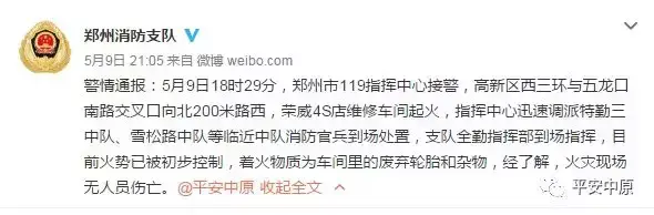 5月9日18时29分,郑州市119指挥中心接警,高新区西三环与五龙口南路交叉口向北200米路西,荣威4S店维修车间起火,指挥中心迅速调派特勤三中队、雪松路中队等临近中队消防官兵到场处置,支队全勤指挥部到场指挥,目前火势已被控制,着火物质为车间里的废弃轮胎和杂物,经了解,火灾现场无人员伤亡。