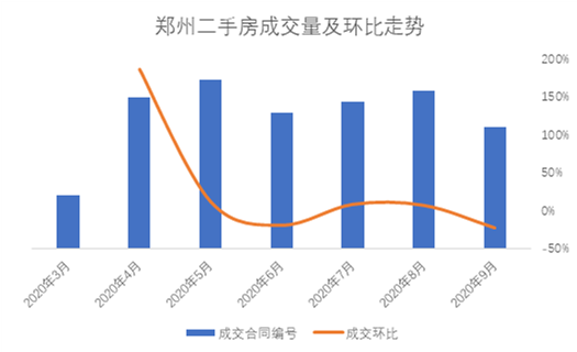根据贝壳研究院数据,2020年4月以来,郑州二手房市场高位成交,4月-9月累计成交同比增长45%,其中9月同比增长约15%,但受8月基数较高影响,成交量环比下降23%。成交价格方面,2019年下半年以来,郑州二手房价格整体处于向下调整阶段,今年6月以后价格企稳,9月环比上涨1.4%,同比止跌转涨,涨幅为1.6%。