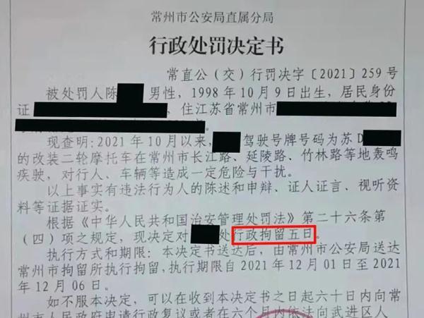 顺藤摸瓜,常州交警深度研判后发现,自今年9月以来,童某和同伴陈某等人多次夜间在市区存在随意追逐其它车辆、炸街扰民、不按规定车道行驶、超速行驶等交通违法行为。目前,童某、陈某二人因寻衅滋事被当地警方处以行政拘留五日。