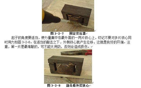 把对侧的那两片也敲出来,这下铁心就没有那么紧了,重复上面的步骤,再敲出一两片来,就不会很困难了。如图3-2-11。