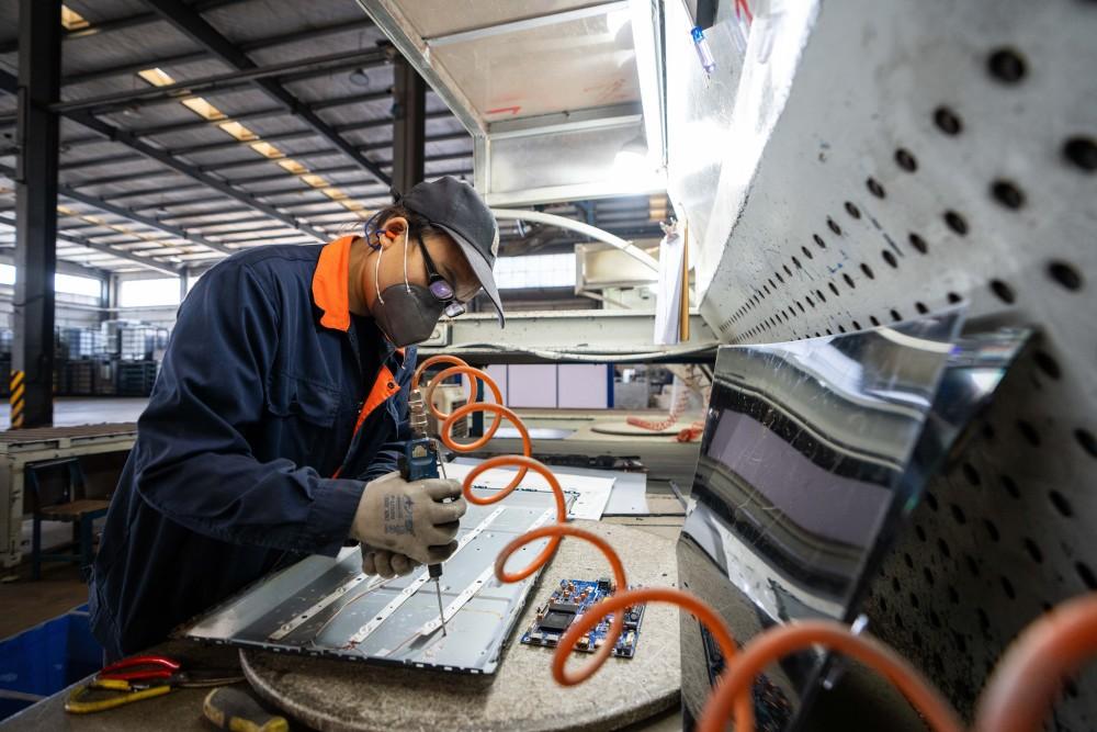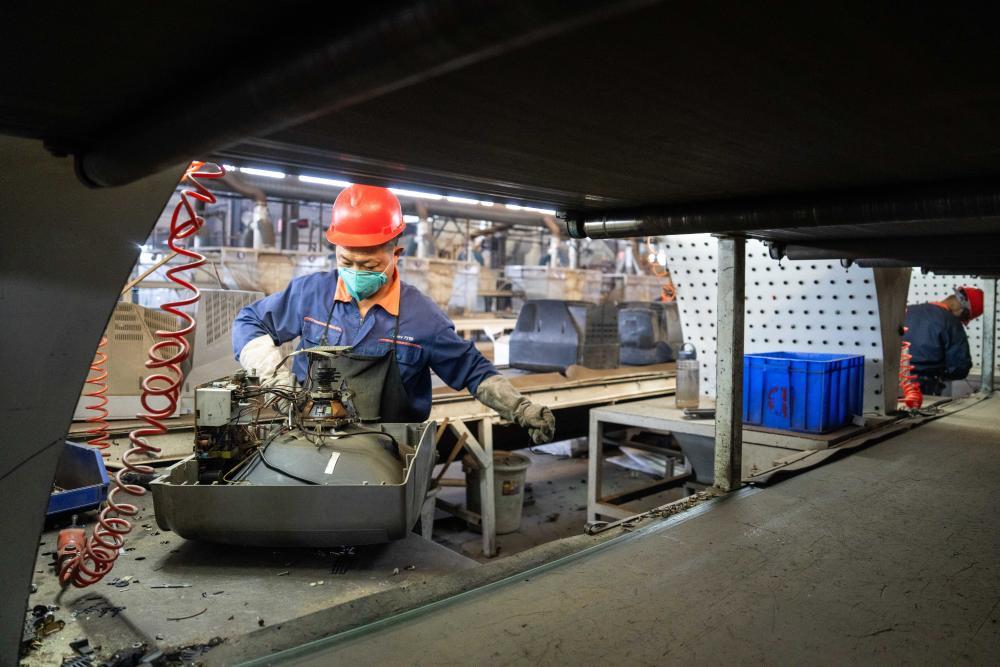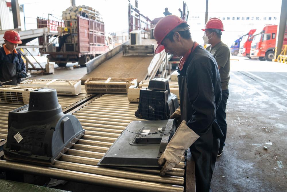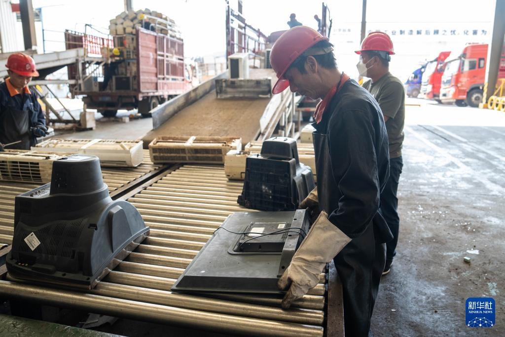 9月25日,在汨罗万容固体废物处理有限公司,工作人员在拆解废旧电器。新华社记者 陈思汗 摄
