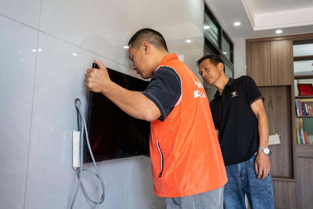 9月24日,在汨罗市屈子祠镇双楚村,彭坤(右一)在家中和安装工人一起打开新电视机的包装。