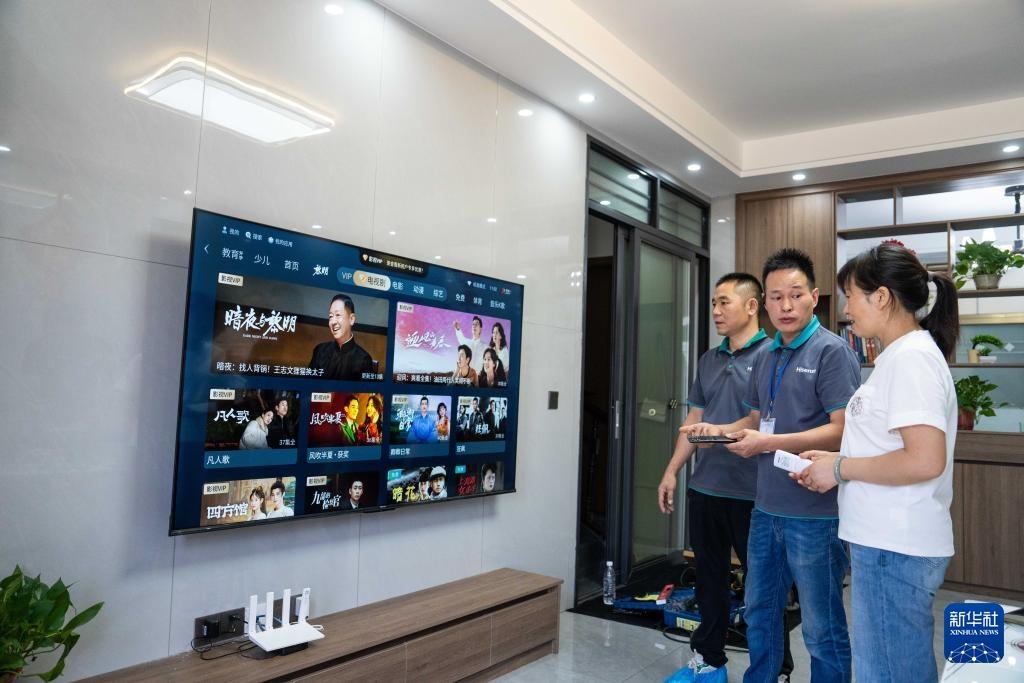 9月24日,在汨罗市屈子祠镇双楚村彭坤夫妇的家中,安装工人向彭建华(右一)介绍新电视使用方法。新华社记者 陈思汗 摄