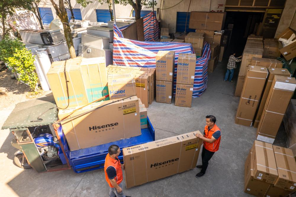 9月24日,在汨罗市天虹电器城仓库,工作人员在搬运电视(无人机照片)。新华社记者 陈思汗 摄