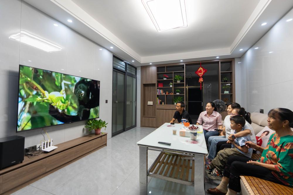 9月24日夜间,在汨罗市屈子祠镇双楚村,彭坤(左一)在家中与家人用新电视看节目。
