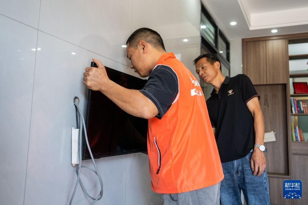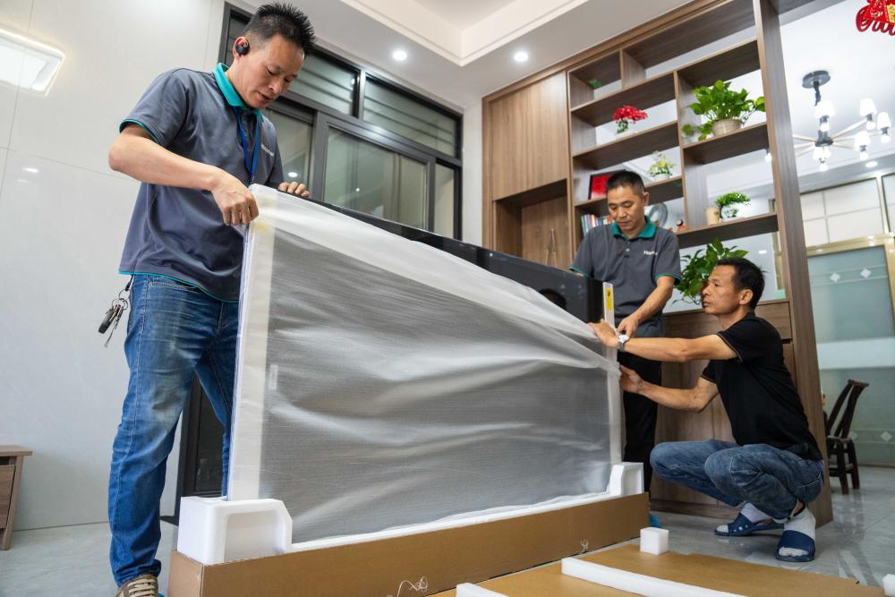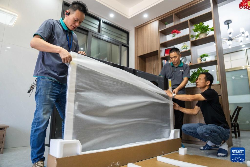 9月24日,在汨罗市屈子祠镇双楚村,彭坤(右一)在家中和安装工人一起打开新电视机的包装。新华社记者 陈思汗 摄