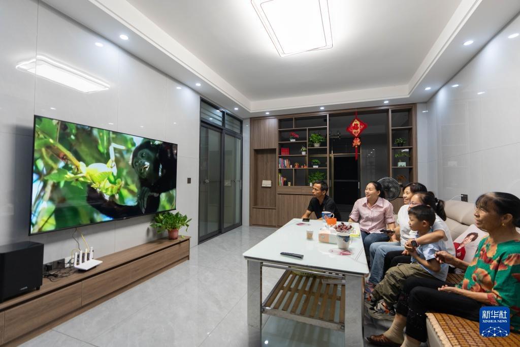 9月24日夜间,在汨罗市屈子祠镇双楚村,彭坤(左一)在家中与家人用新电视看节目。新华社记者 陈思汗 摄