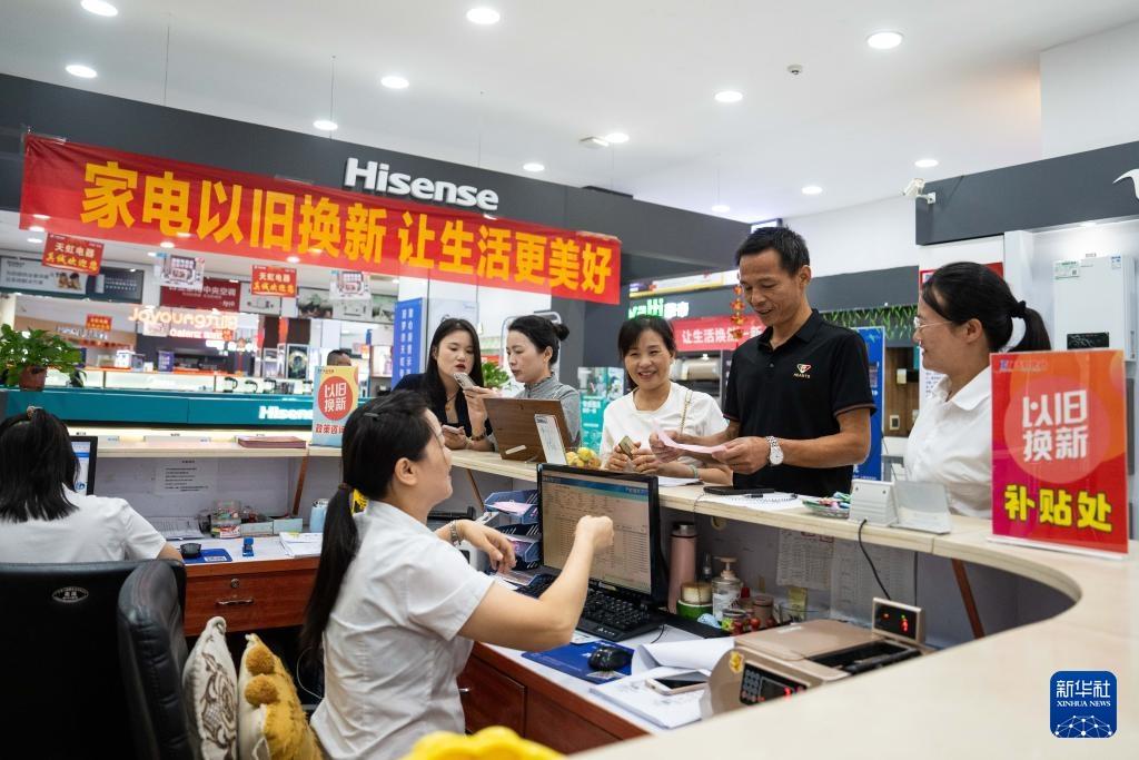 9月24日,在汨罗市天虹电器城,彭坤(右二)参与以旧换新活动后付款购买新电视。新华社记者 陈思汗 摄