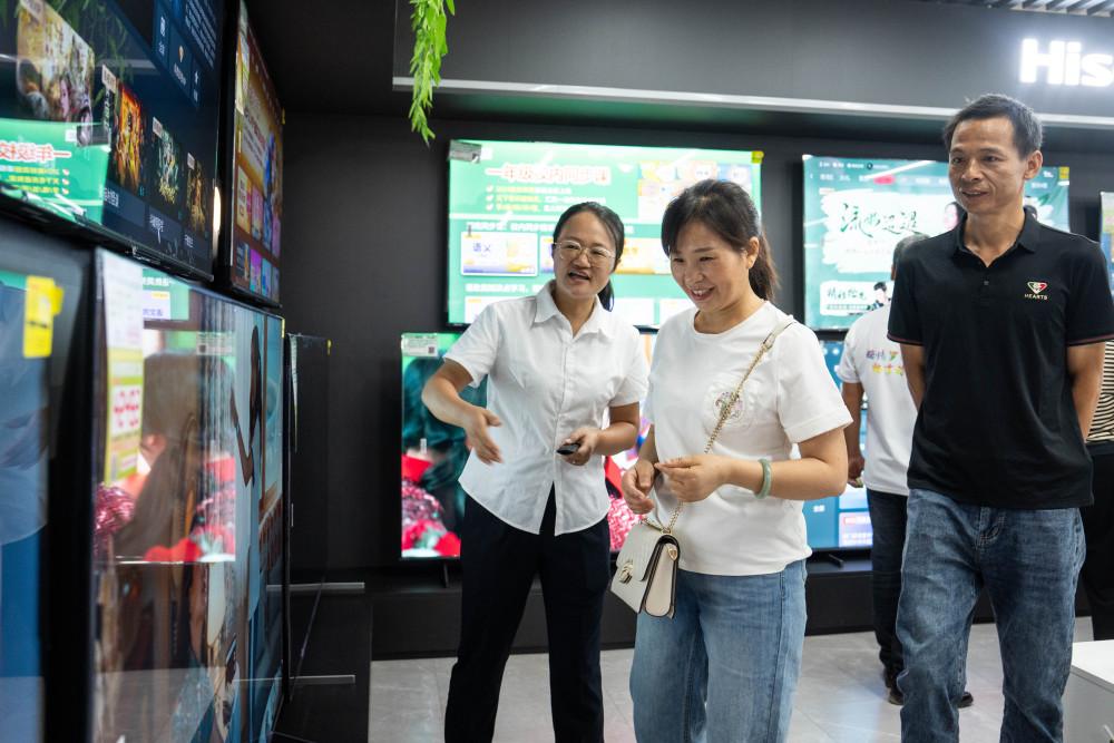 9月24日,在汨罗市天虹电器城,彭坤(右二)参与以旧换新活动后付款购买新电视。