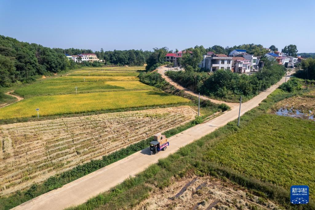 9月24日,在汨罗市屈子祠镇,工作人员在送货(无人机照片)。新华社记者 陈思汗 摄