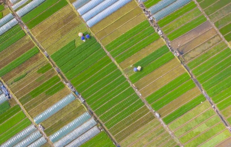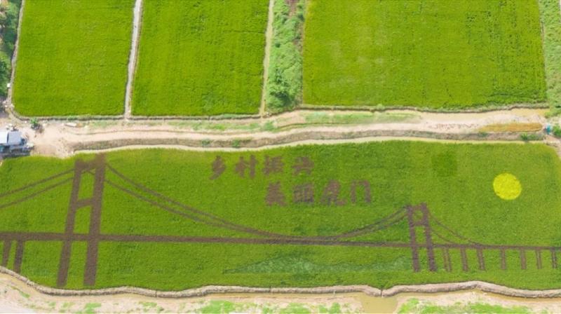 原来,这片农田位于虎门沙角社区,从高空俯瞰,彩色的稻田勾勒出一座“虎门大桥”。画卷中间还配有“乡村振兴 美丽虎门”的字样。勤劳的农民以稻田为“画卷”,以彩稻为“画笔”,用四色水稻“绘制”出这一道极具虎门特色的别致乡村图景。