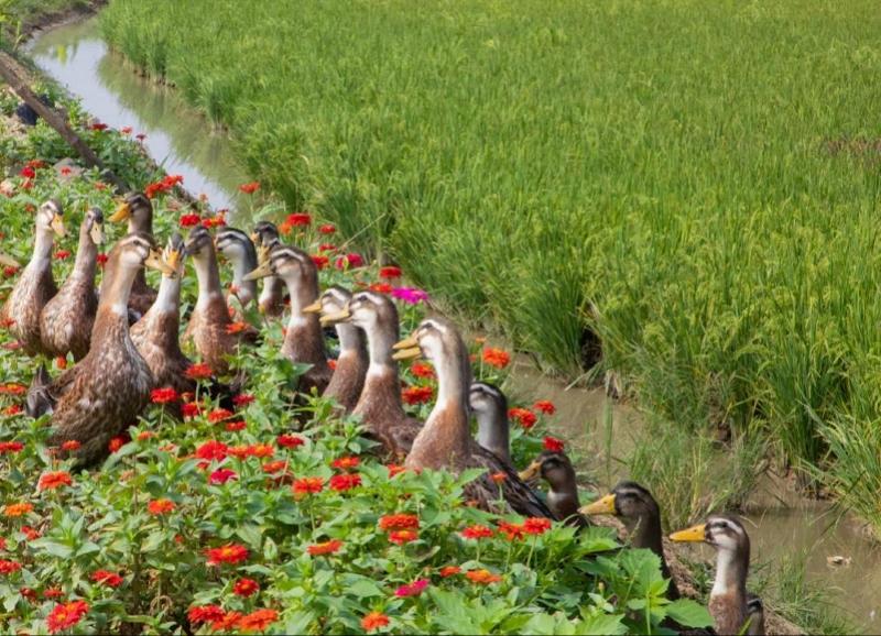稻田里种植的水稻品种以“美香占2号”为主,产量可达每亩800多斤,成熟后都可以食用。稻田里散养的稻田鸭能够吃杂草和虫子,有助于减少除草剂和杀虫剂的使用,让粮食更加安全。