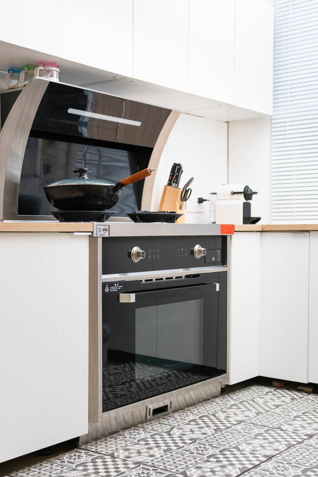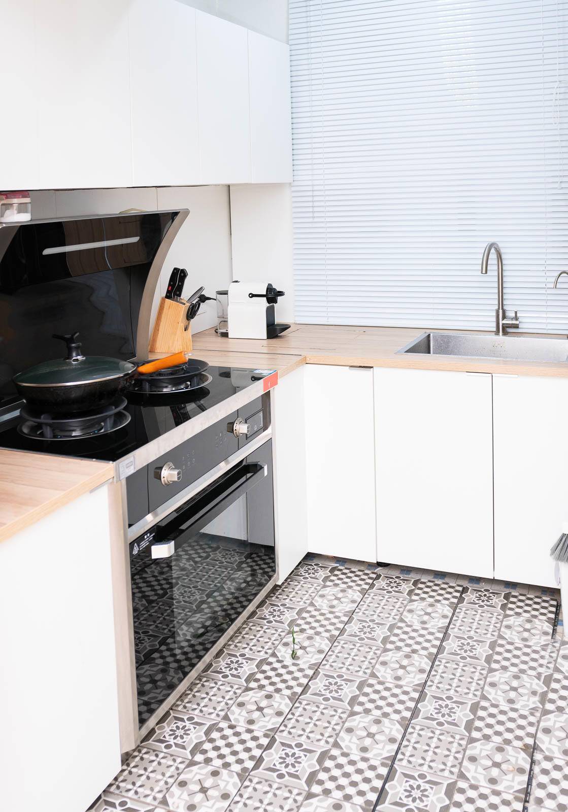 ▼由于使用了集成灶,上方可以做整排的吊柜。对于小厨房,吊柜的使用率也非常高。你可以看到,想这种小厨房,除了地柜和吊柜中间的部分,基本就没有需要贴砖的部分了,这里我直接使用了宜家的哈利格橱柜面板贴在了原有的旧砖上,由于集成灶后部有烟道,也不用担心明火的问题。地砖的部分用的是宜家的户外地砖,可以直接放置在原用的地砖上,长期使用下来清洁也没有问题。