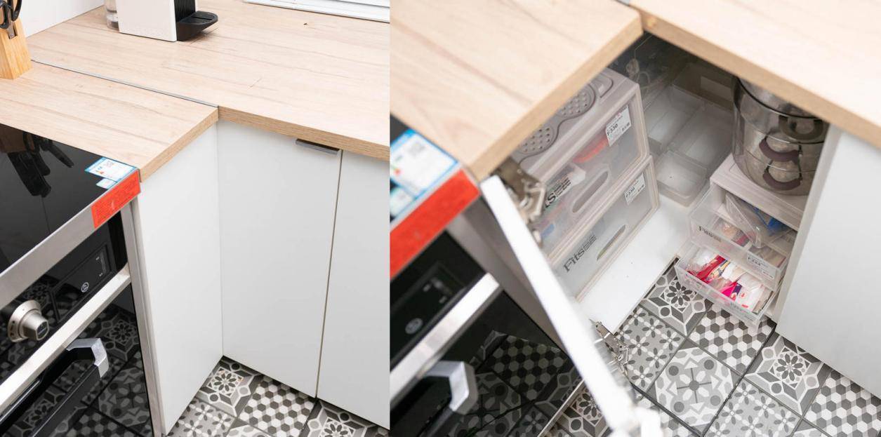 ▼地柜转角的部分,使用了宜家的转角专用柜,使用两节式的折叠门,有效利用转角空间。没有配宜家的转角拉篮,一个是因为gui。。。二是转角拉篮的空间浪费比较多。利用上原来的几个爱丽丝的抽屉,在做到方便的同时,空间利用也最大化。