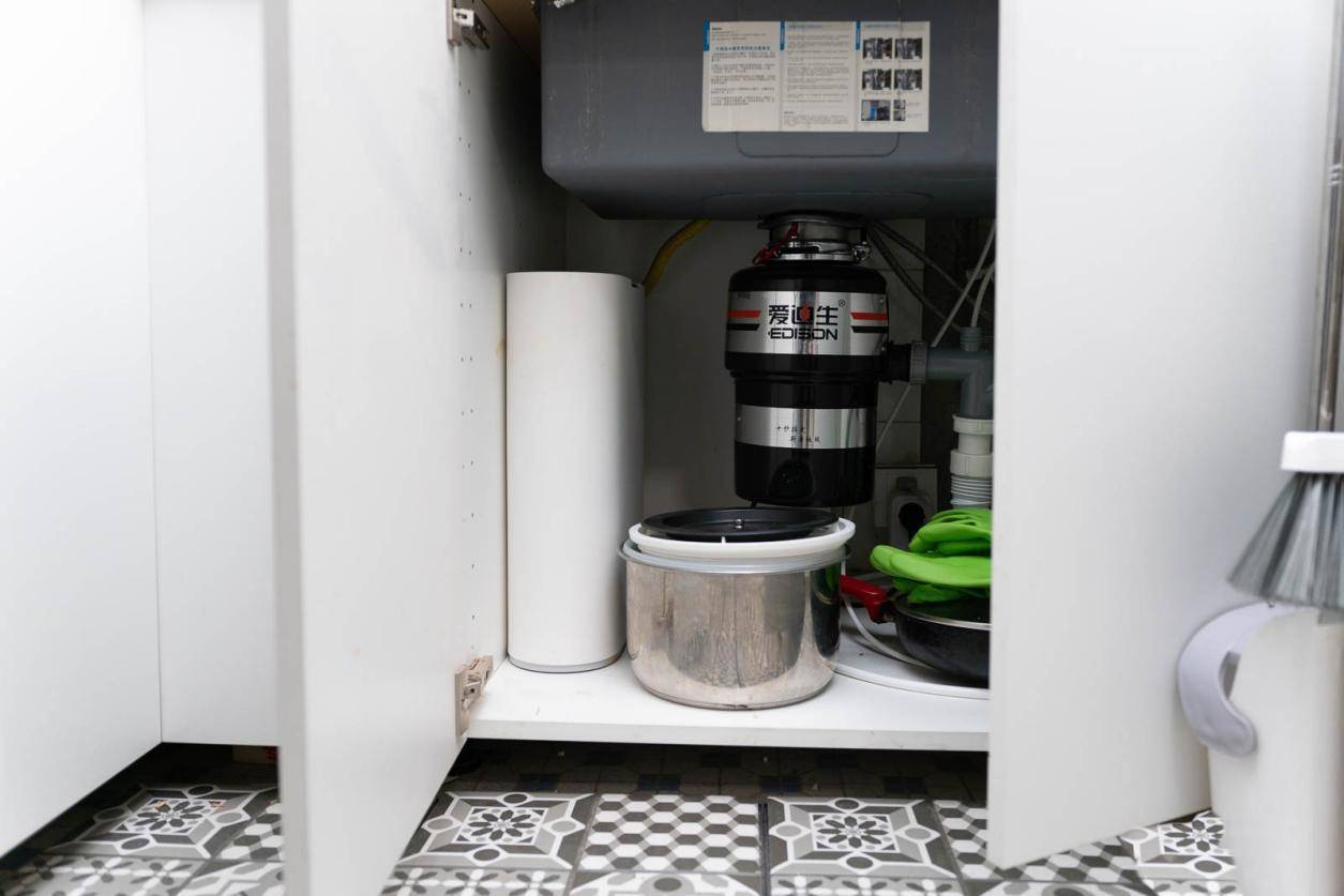 ▼水槽底柜内放置了小米的净水器以及爱迪生的垃圾处理器。