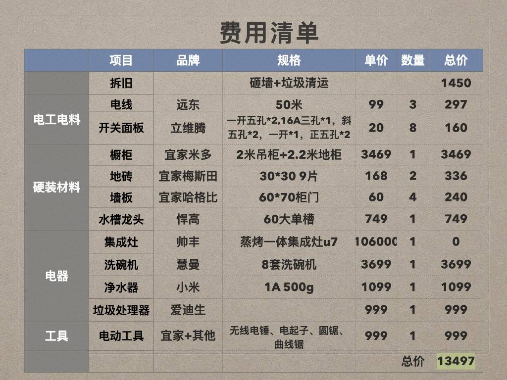 ▼费用清单共分为五个大类,包括拆旧、电工电料、硬装材料、电器、以及安装工具。即使简单搞搞也花费了1.3w,真的是金厨银卫呢。对比只含硬装在1.2w左右的装修小公司还是便宜了不少。