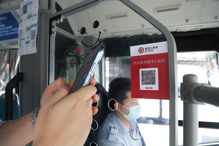 2022年4月29日,在重庆市璧山区,一名乘客使用数字人民币付款乘坐公交车。新华社发