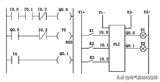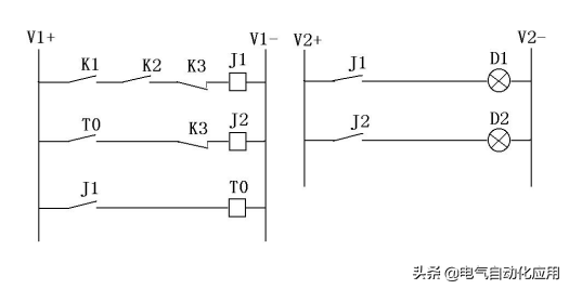 例如,有两个开关K1、K2。控制要求,只有两个开关都接通时小灯D1才亮。当D1亮2秒钟后小灯D2开始亮。当开关K3切断时两个小灯就同时熄灭。
