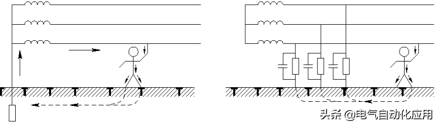 当人站在地面上或其他接地体上, 人体的某一部位触及一相带电体时, 电流通过人体流入大地(或中性线), 称为单极触电, 如图1.1所示。图1.1-1(a)为电源中性点接地运行方式时,单相的触电电流途径。图1.1-1(b)为中性点不接地的单相触电情况。一般情况下,接地电网里的单相触电比不接地电网里的危险性大。