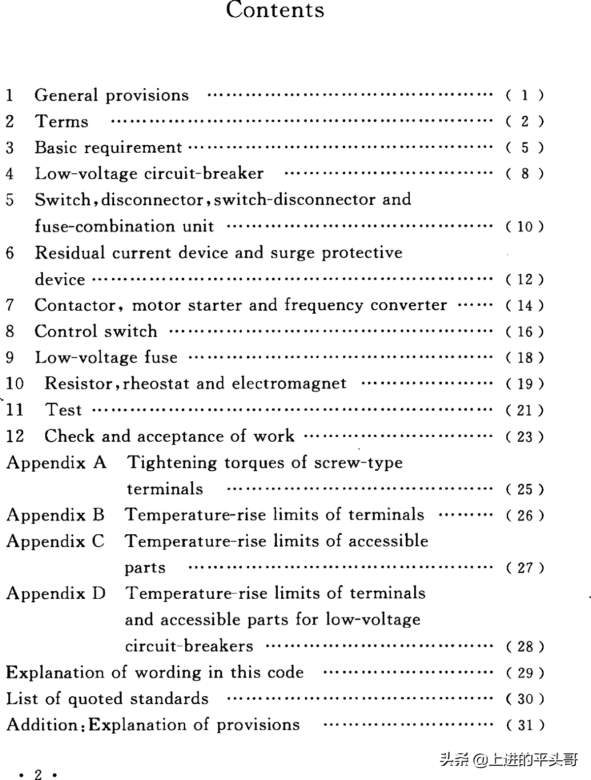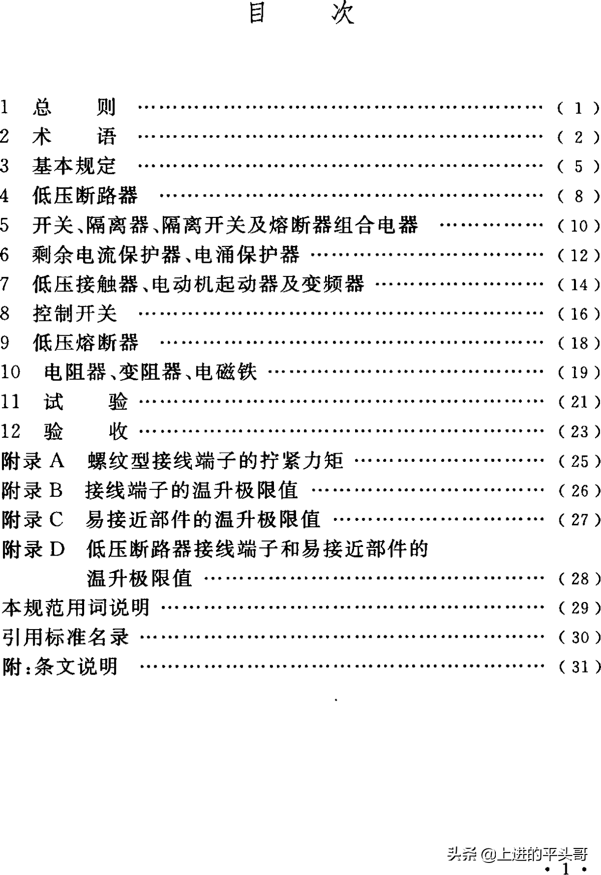 本规范共分1 2 章和4 个附录,主要内容包括总则,术语,基本规定,低压断路器,开关、隔离器、隔离开关及熔断器组合电器,剩余电流保护器、电涌保护器,低压接触器、电动机起动器及变频器, 控制开关,低压熔断器,电阻器、变阻器、电磁铁,试验,验收等。