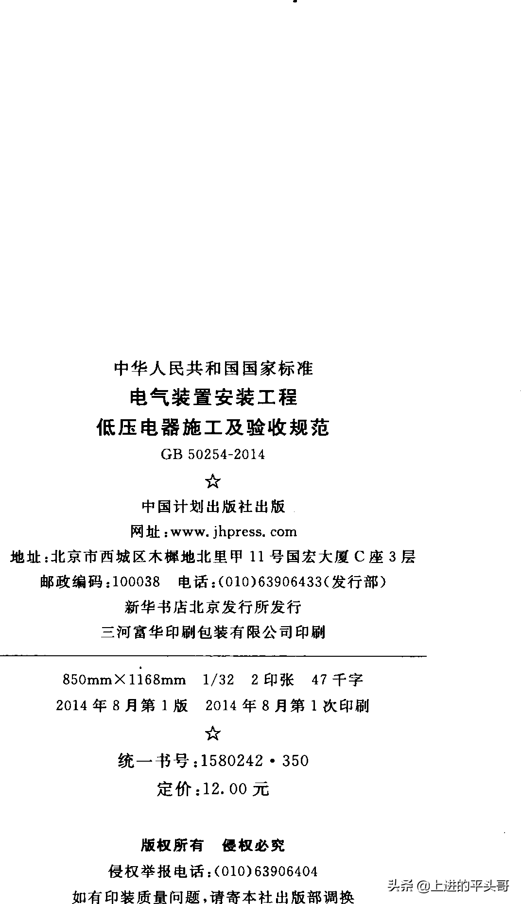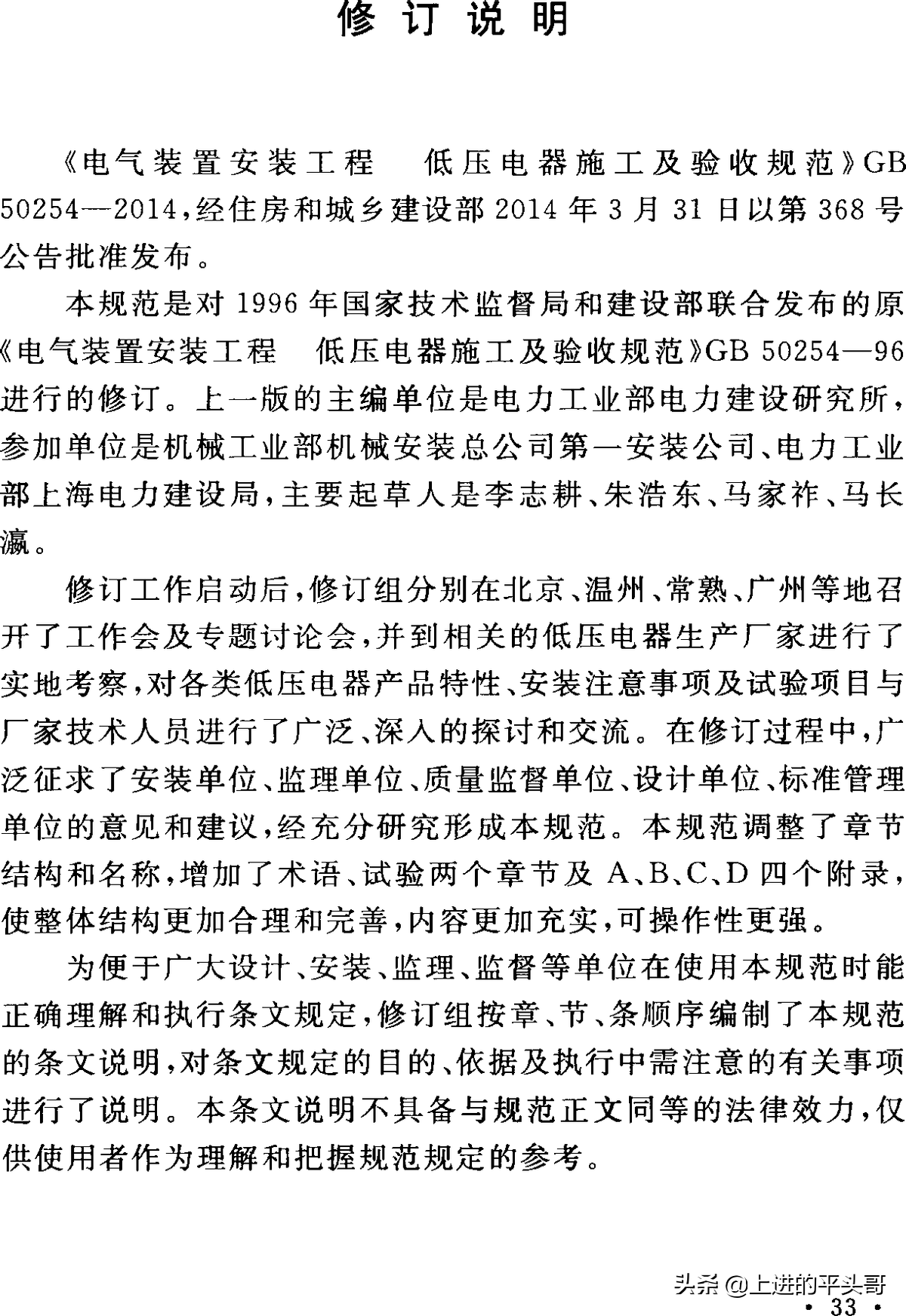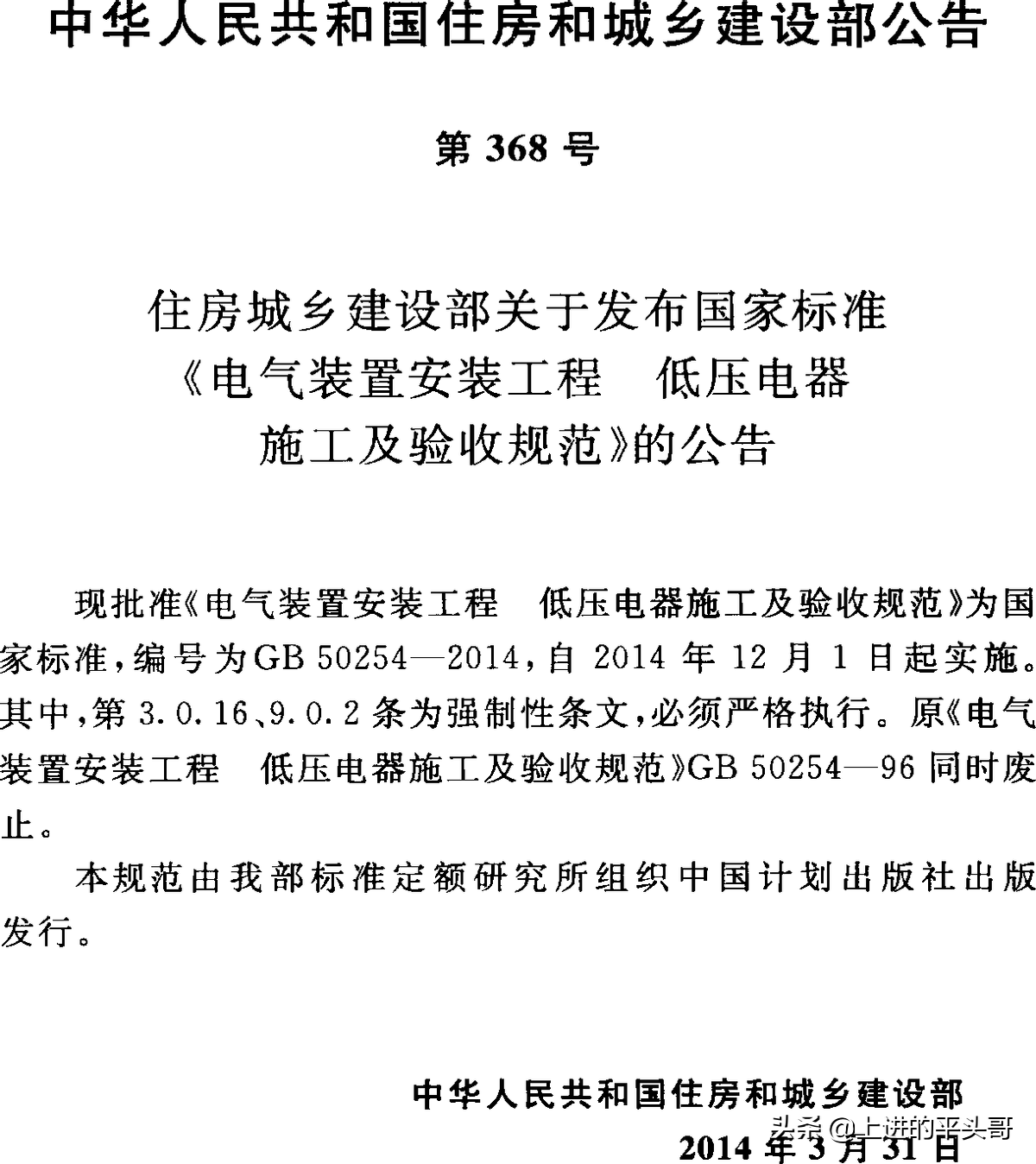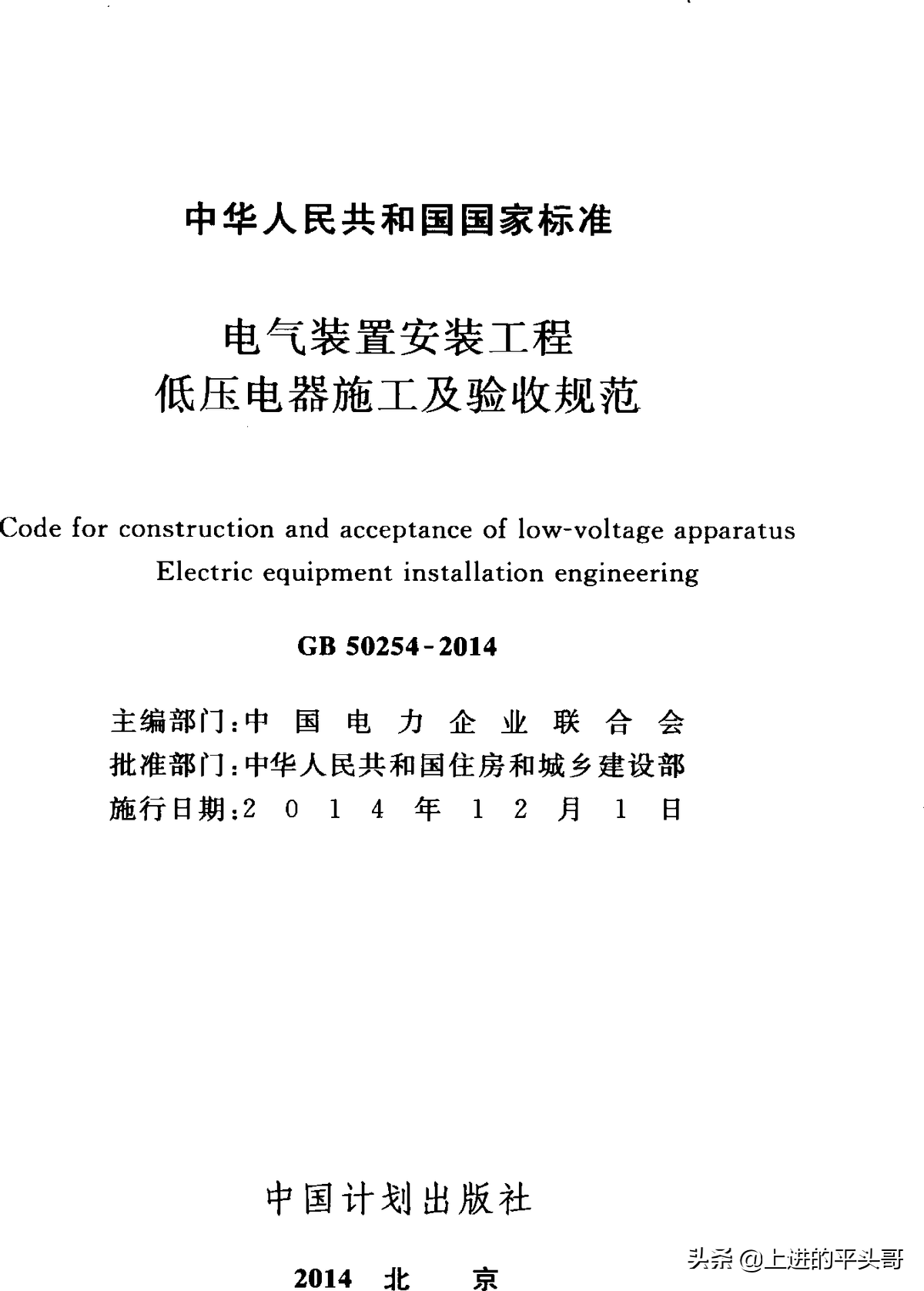 现批准《电气装置安装工程低压电器施工及验收规范》为国家标准,编号为G B 50254— 2014 ,自 2 0 1 4 年 1 2 月 1 日起实施。