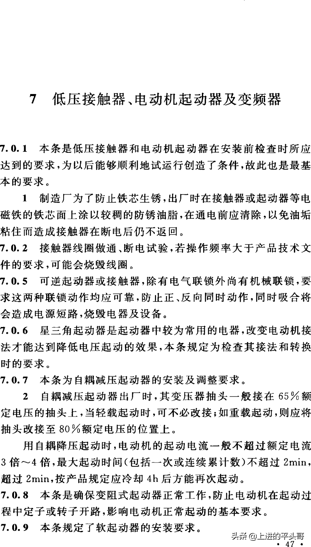 7 . 0 . 7 本条为自耦减压起动器的安装及调整要求。