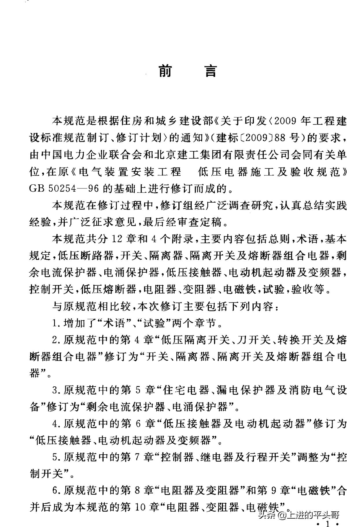 设标准规范制订、修订计划〉的通知》(建标〔2009〕8 8 号)的要求, 由中国电力企业联合会和北京建工集团有限责任公司会同有关单位,在原《电 气 装 置 安 装 工 程 低 压 电 器 施 工 及 验 收 规 范 》G B 50254— 9 6 的基础上进行修订而成的。