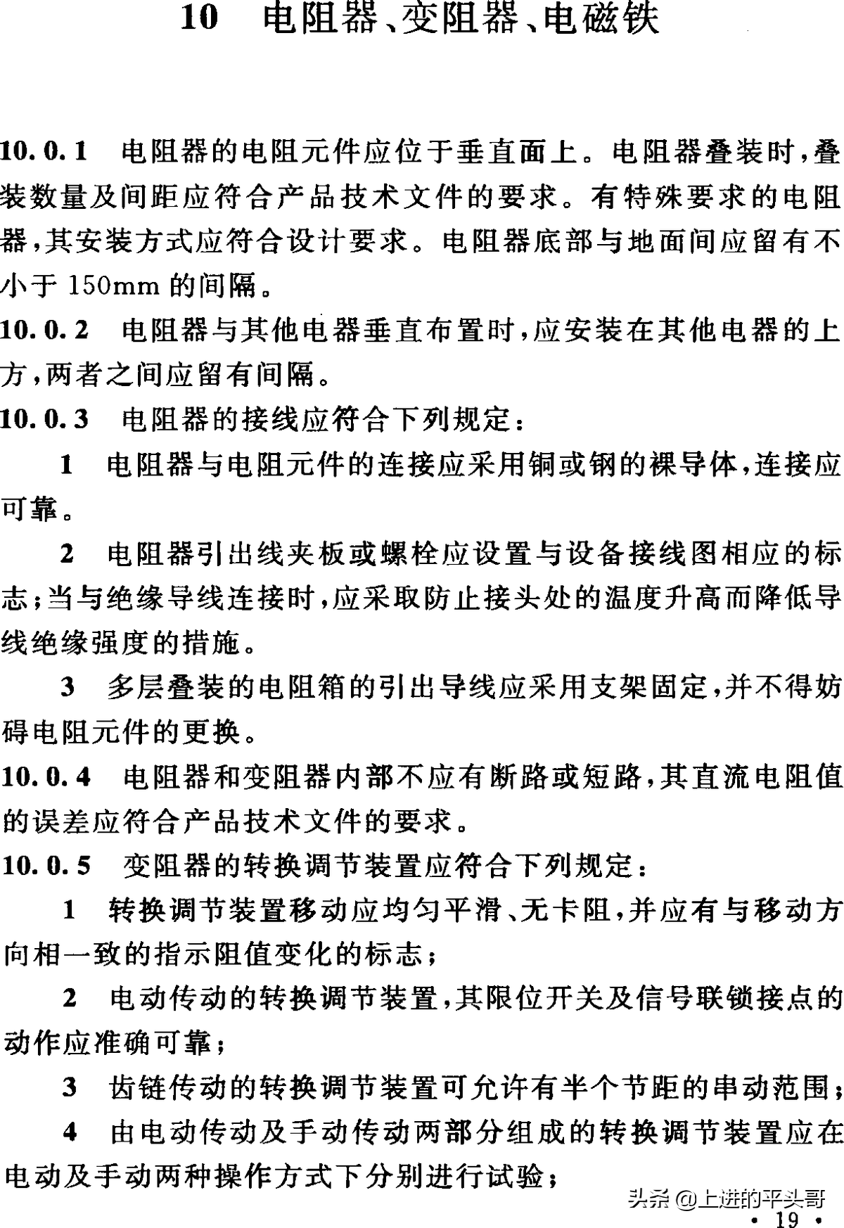 10. 0. 5 变阻器的转换调节装置用来改变阻值,以调节电动机的转速或直流发电机的电压。因此对转换调节装置的移动、限位开关、电动传动、手动传动等的功能均应按产品技术文件的规定进行试验。